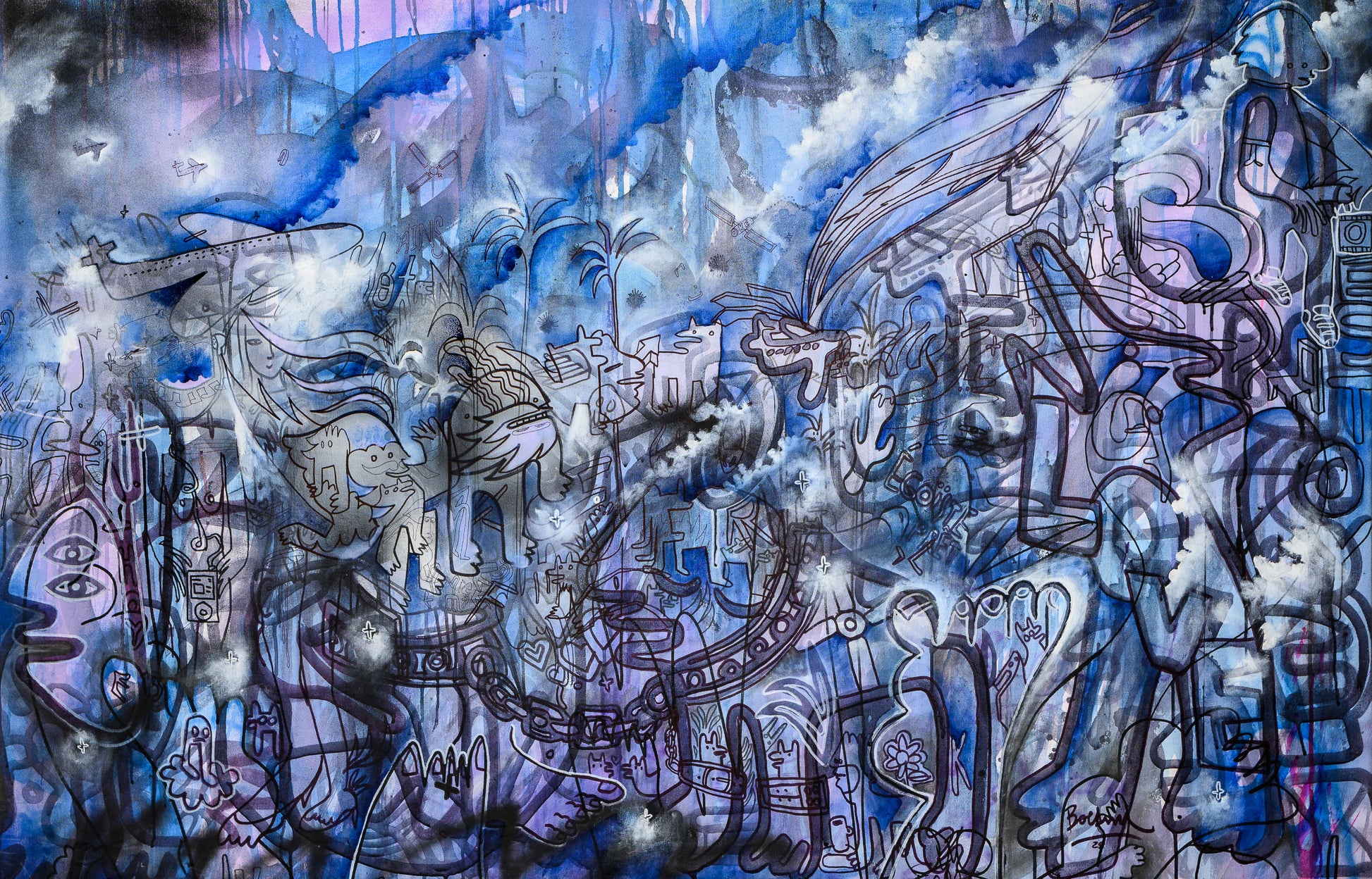 Técnica: Pintura acrílica, marcadores permanentes y spray sobre lienzo. 97 x 149 cm. U$ 7.000