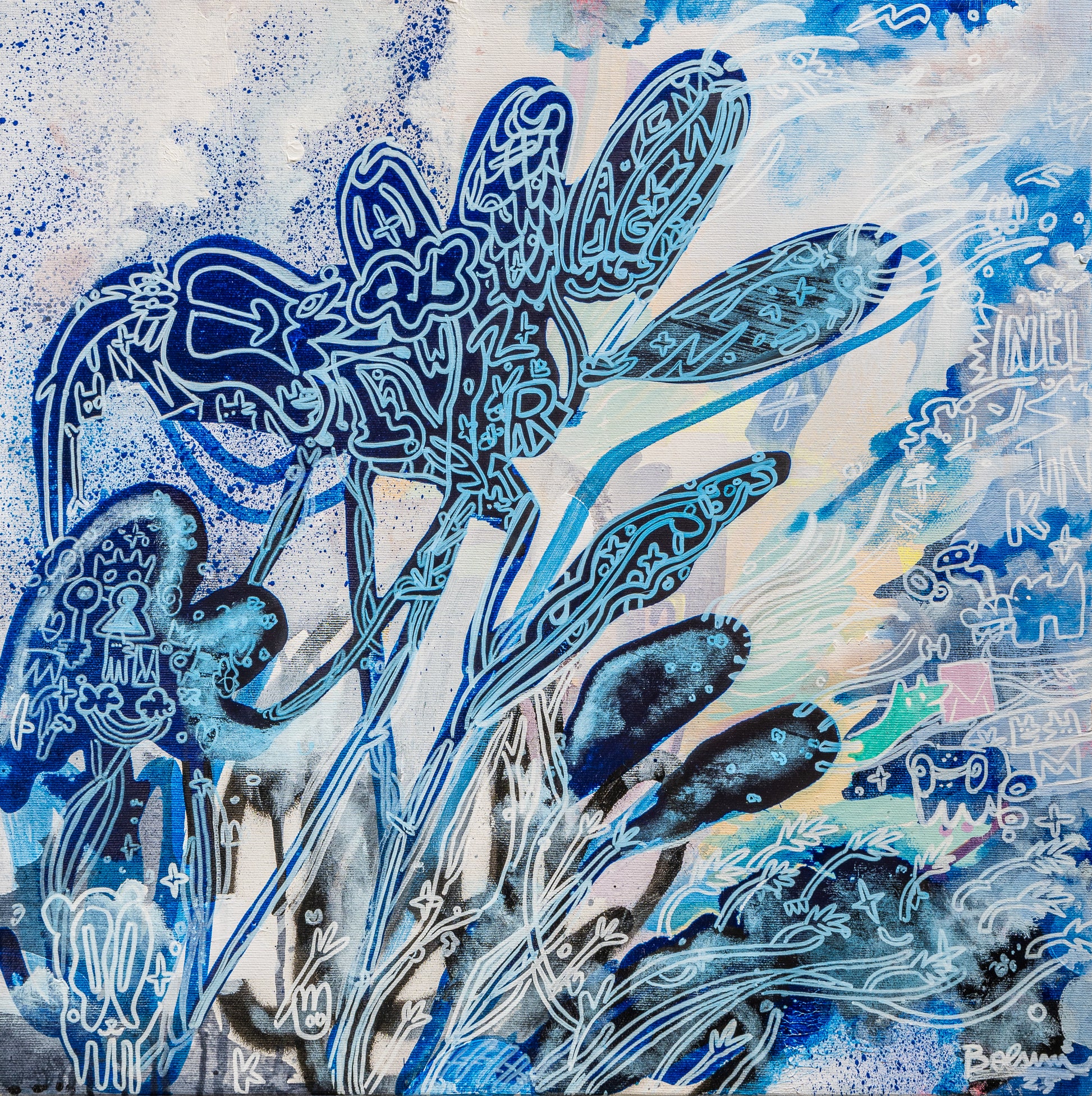 Técnica: Pintura acrílica, tinta y spray sobre lienzo.